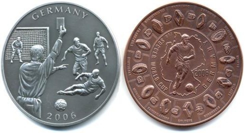 為了紀念2006年在德國舉辦的世界杯比賽,利比亞發行了巨大的 2.5英寸硬幣(其實不能稱之為巨大,但在硬幣中算是大的了),面值為5元,專門為足球賽設計。但奇怪的是,右側的硬幣邊緣是一圈面包圈,這些瘋狂的利比亞人!