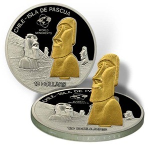 這些具有紀念意義的硬幣上,刻的是著名的復活島巨石人像,鍍金的摩艾巨人像可以豎起來,給您的硬幣收藏,增添新的視角。傳說中稱,古代的每個巨石人像中,都有一只永生的倉鼠轉動輪子,給每尊石像注入能量。