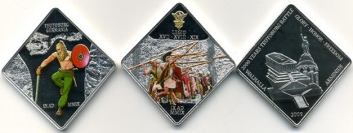 帕勞共和國,用條頓堡森林戰爭的紀念幣,再次展現了身處德國殖民地時期的歷史。這場戰爭,阻止了羅馬帝國在北歐的擴張,取得了巨大勝利。硬幣表面鍍銀,一面刻著不掉色的圖片,另外一面刻著帕勞共和國的國徽紋飾