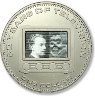 這枚硬幣是在2006年,為了紀念發明電視80周年而鑄造的,純銀幣內的全息圖像,代表了當時電視機傳送的第一幅圖像。左側圖像是電視機的發明者,英國科學家約翰·洛吉·貝爾德,右面圖像是至今困擾電視機的電鬼(模糊圖像)。