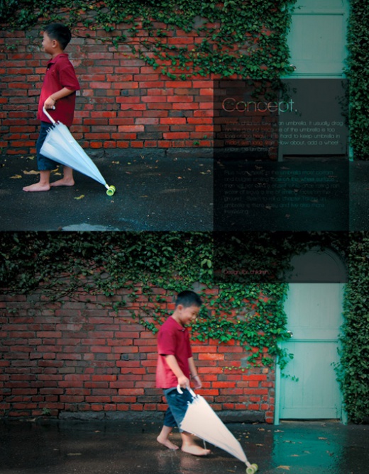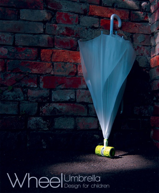 ▼走在路上有時會看到小朋友拖著長長的雨傘,傘上方的柄拖久了可能會裂開或磨損,設計師便在傘的前方加個輪子,輪子上還印了可愛的圖案經過水窪時還會像蓋印章一樣印出圖案,不僅有趣也因為多了一個支撐,所以在濕滑的地面就不怕小朋友跌倒了