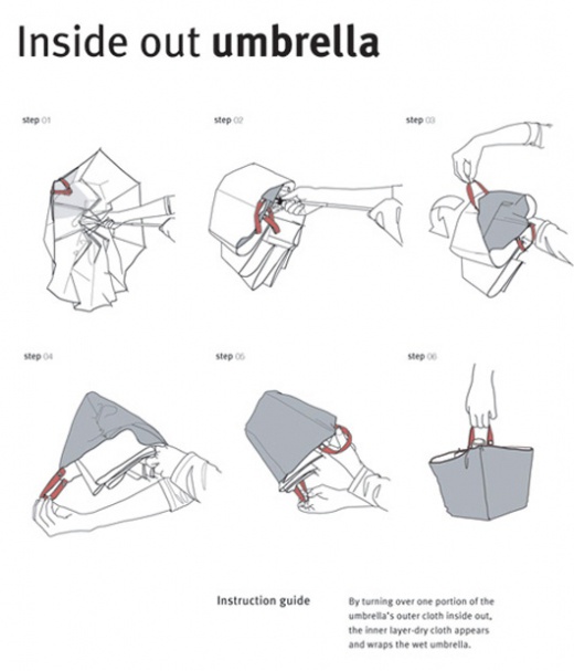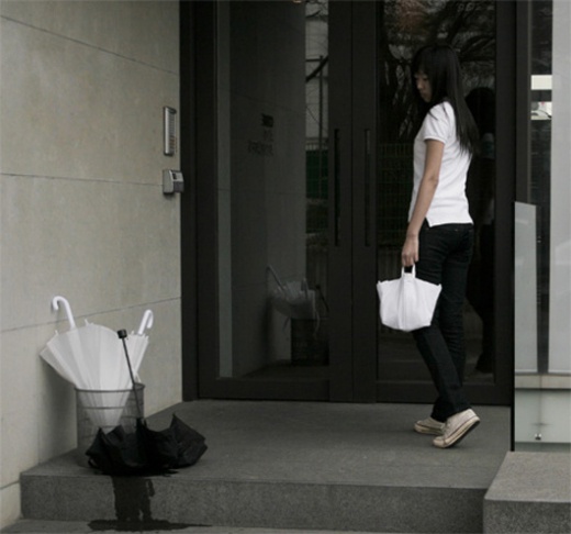 ▼下雨天出外購物或是用餐時,常要將心愛的傘放在外面,這時只能祈禱傘別被幹走, 不然等會就要淋雨了,這種七上八上的心情也許大家都有過,或是將傘拿進友人家或店家時,而外面剛好放晴了,傘也就忘記拿走了~囧所以貼心的設計師想到了兩全其美的方法,設計了一款可以將傘折成包包,不僅隨時可以將心愛的傘提著,如果傘是濕的折起來之後,濕的一面便會在袋子內側,所以也不怕外面下大雨室內下小雨了