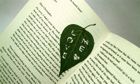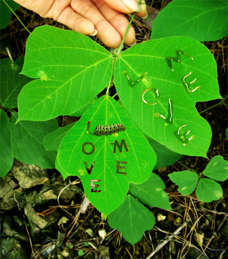 這個作法首先要培養毛毛蟲大軍,不想培養的人也可以抓他們!然後用棒子沾蜂蜜將要表達心意的文字或圖案畫在樹葉上!再將蟲蟲大軍放在葉子上,它們就能按圖索驥,將所要的文字及圖案完整的呈現,看!這樣子方式是不是獨特具有環保且復含創意呢?