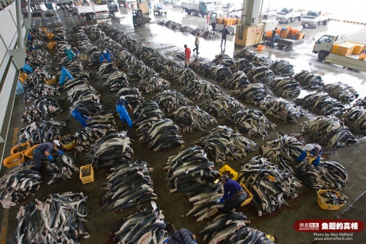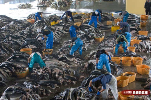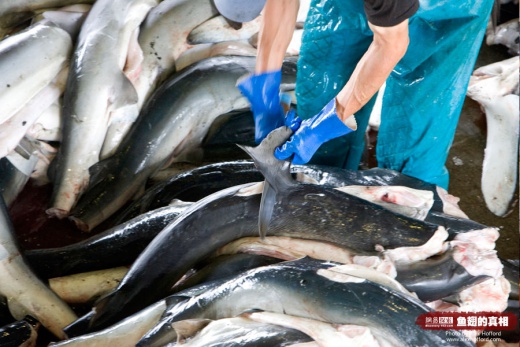 工人們穿梭于鯊魚堆的過道 熟練而迅速地