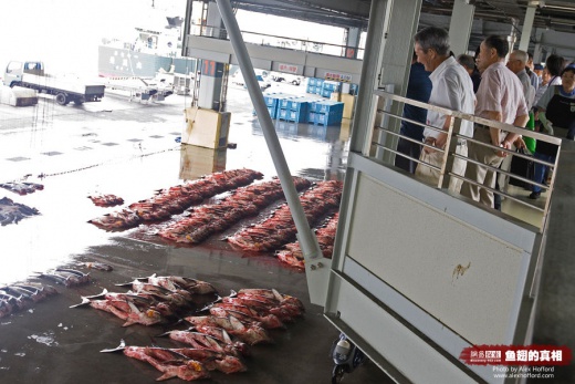 圖為日本游客們饒有興致地參觀鯊魚處理工廠。