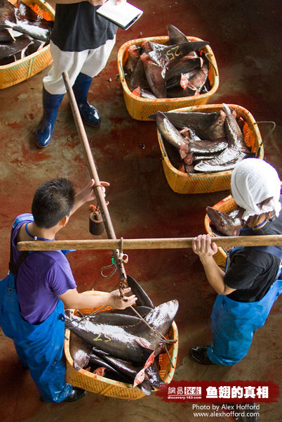 工人們用黃色的小塑膠籃子裝被割下的魚鰭