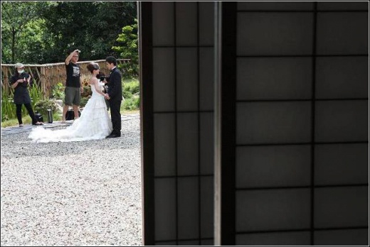 屋外又一陣喧嘩,原來又一對新人進來拍婚紗照了,這個小時內就看了三對佳偶呢…