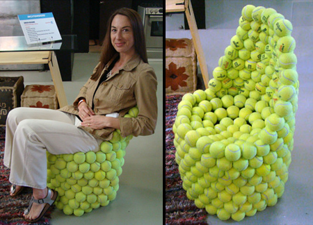 網球拼裝成的椅子,利用一顆顆的網球,也可以雕塑成椅子造型,不知道坐起來舒不舒適?