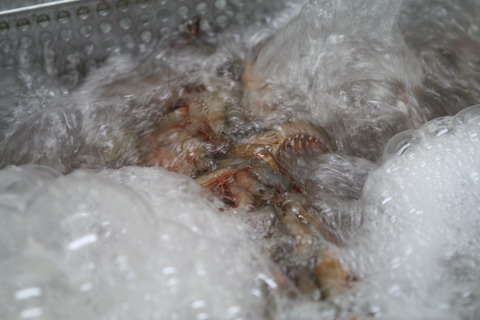 首先來到了處理的海鮮的區域,王瑞瑤說她上次來參觀時,這個地方處理的是螃蟹,這一天處理的是劍蝦。蝦子看起來像在洗SPA,其實這是一台超聲波的解凍機。