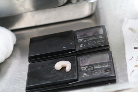 將將,答案揭曉,他們在幫蝦子量體重。將蝦子清理乾淨之後,分成四種不同的等級,由大而小,分別用來炒飯、燒賣、蝦餃和餛飩。