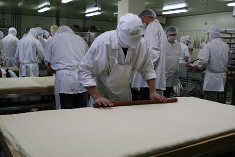 Massi對於麵食類超有興趣,不但拿起製麵的鹼水拼命發問,實在是太好奇,整個參訪行程又忽然倒帶,折回來麵食區讓他嘗試製作棉被,阿不是,是千層糕啦!