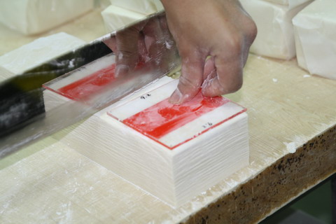 隔著一條走廊的另一間房間,則是專門處理肉品的地方。豬肉在處理過程當中,都要嚴格掌控溫度,只見現場師傅快手快腳的去筋剔膜。