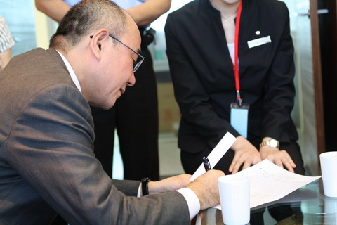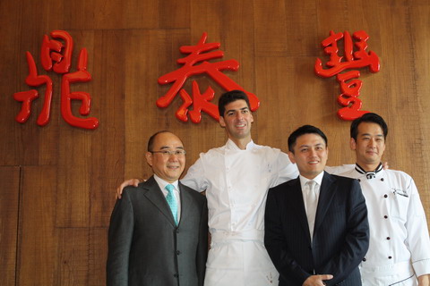 在開始參觀之前,穿上白色的隔離衣,先來個大合照,並介紹出場角色,左起為鼎泰豐老闆楊紀華、Chef Massi和喜歡別人叫他Jerry的三二行館董事長邱泰翰。