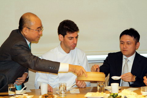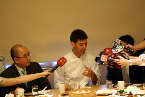 而且吃完要馬上發表感想,性喜低調的Jerry整個被麥克風群擋住,鏡頭外沒拍到的是Massi的副主廚,趁著這個時候大口大口的吃鼎泰豐美食。