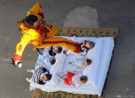 一個穿著明亮的黃色衣服的人躍過床墊又安全降落在另一邊,完全漠視嬰兒。
