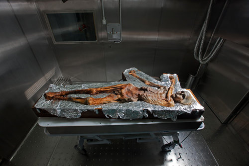 1991年,德國遊客在義大利和奧地利邊界標誌――阿爾卑斯山上的冰雪裏發現了這具木乃伊