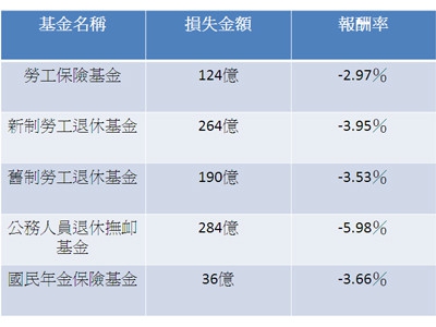 立法委員李應元整理政府年度決算後發現,各項政府基金投資績效不彰,包括被周刊點名20年內會破產的勞保基金、新制勞工退休基金、舊制勞工退休基金、公務人員退休撫卹基金及國民年金保險基金等,通通都虧損,總計損失金額將近新台幣898億元。