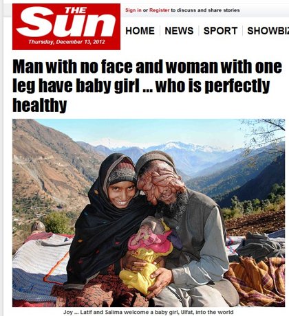 身體有缺陷雖然會令人難過,但彼此如果可以相互接受認同,甚至還相愛結婚產子,那就真的是「真愛」。印度有一對年輕夫妻,丈夫從小罹患怪病,臉部肌肉無限制的增生,幾乎看不到他的臉,未失明的他眼睛全被遮住,等同全盲;妻子則是出生就只有一條沒腳掌的腿,兩人卻在08年結為連理,日前還生下健康的小孩。