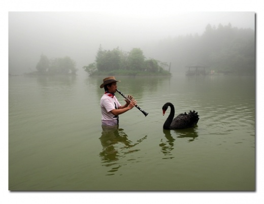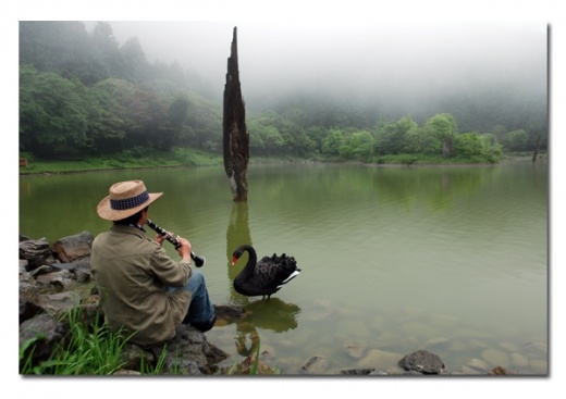 「剛到山裡時難免孤獨,而且池邊不是隨時有遊客,這隻黑天鵝往往是唯一的聆聽者,我把黑天鵝當作傾訴心裡怦動的對象」林源泉談起著與這隻名叫「阿娥」的黑天鵝交心的過程,他們常常在濃霧中靈犀獨處,音樂變成他們溝通的共同語言。