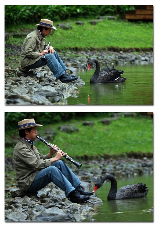 ↑明池湖畔林源泉豎笛聲一起......黑天鵝即會出聲應和.........