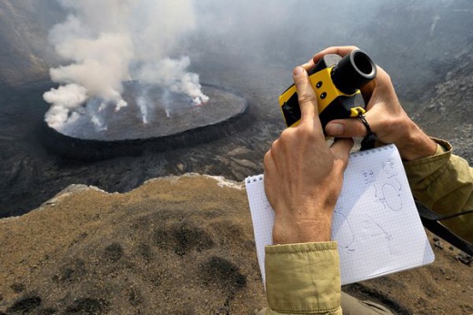 11 一位隊員正在用激光測距儀檢查熔岩湖規模的變化情況。