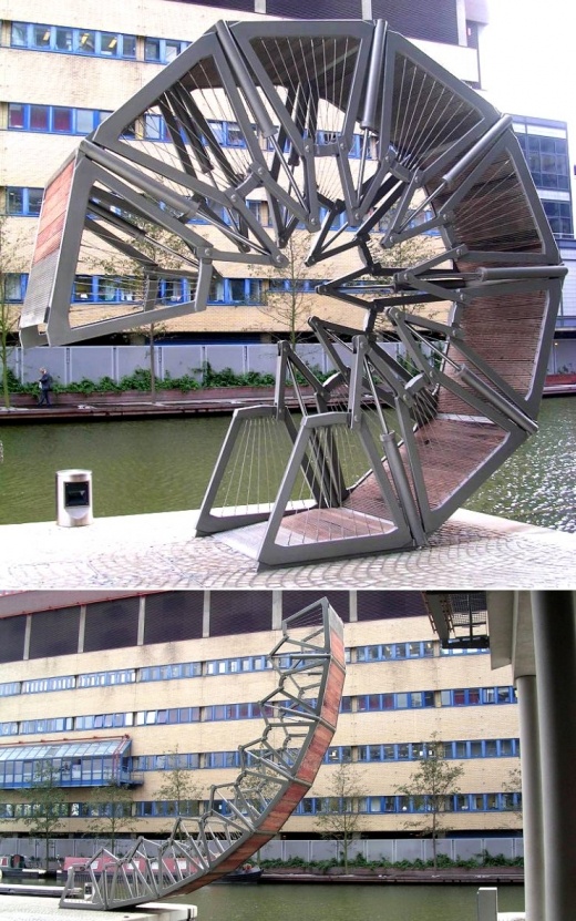Thomas Heatherwick's award-winning rolling bridge is an ingenious addition to the grand union canal system in London and is unique.. Unlike regular movable canal bridges, the rolling bridge curls up to form an octagon by way of hydraulic jacks to let ships pass.