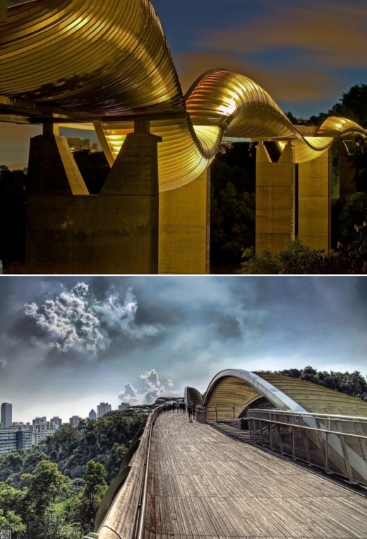 'Henderson Waves' is Singapore 's highest pedestrian bridge and is at the 'Southern Ridges,' a beautiful 9 km (six miles) stretch of gardens and parks. The deck of the bridge is made from thousands of Balau wood slats, perfectly cut and arranged, and along the length of the deck a snaking, undulating shell forms sheltered seating areas on every upward curve.