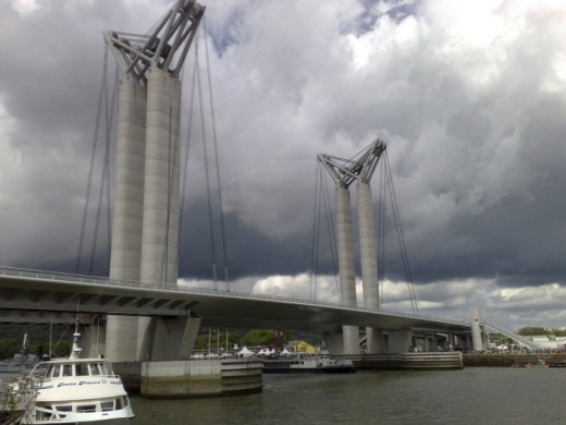 This incredible vertical lift bridge is in Rouen , France , whose spans weigh 1,200 tons each but can be hoisted 180 ft vertically in an impressive 12 minutes. The angular lift structures at the top of each tower weigh 450 tons each. The huge vertical lift allows even the largest cruise liners to sail through.