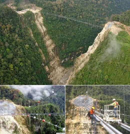 This bridge supports two pipelines - one gas, the other oil - across the extremely deep gap in Papua New Guinea . If this were to be officially recognized as a vehicular or pedestrian bridge it would rocket to the top of the 'world's highest bridge-span' with the pipelines at an impressive height of 1,290 ft above the bottom of the gorge. By comparison, the current highest bridge span title belongs to the Royal Gorge Bridge in Colorado , hanging a mere 1,053 ft above ground level.