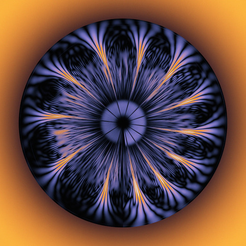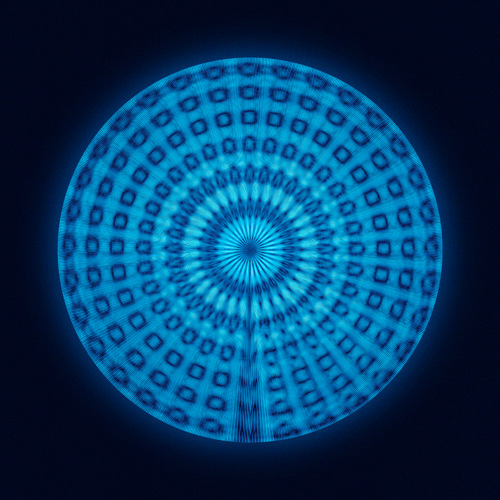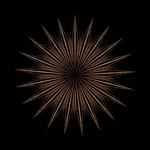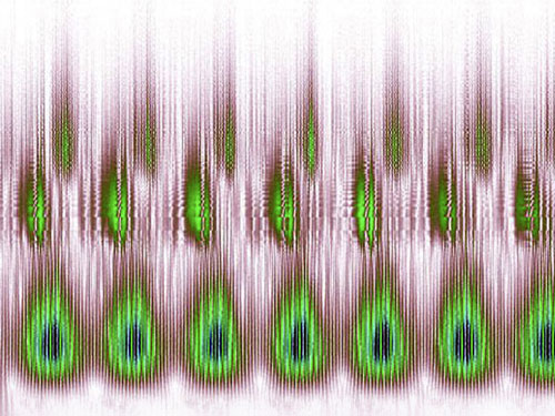本圖所表達的聲音與前一圖相同,但費舍爾采用了不同的小波類型進行轉換,并對轉換結果進行再制作,從而形成了圖中美麗的花朵圖案。本圖其實是一種合成圖,“花朵”的每個花瓣分别是由錄音中的不同部分的可視化圖像所形成的。費舍爾把每一聲音片段的圖像層疊,旋轉並改變大小,最終産生了本圖的效果。