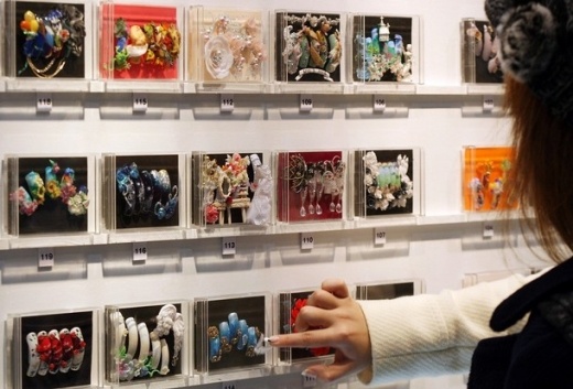 A visitor takes pictures of designed nail chips that are displayed for a competition