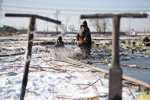 在北京市通州台湖鎮,有許多湖南、安徽來的外鄉人來承包農田種藕,規模幾畝到幾百畝不等,有的已在此經營十年之久。很大部分的藕要在冬天出售,為了保質,他們會把藕塘灌上滿滿的河水。冬天的氣溫低至零下,藕塘白茫茫一片,結了一尺多厚的冰層。