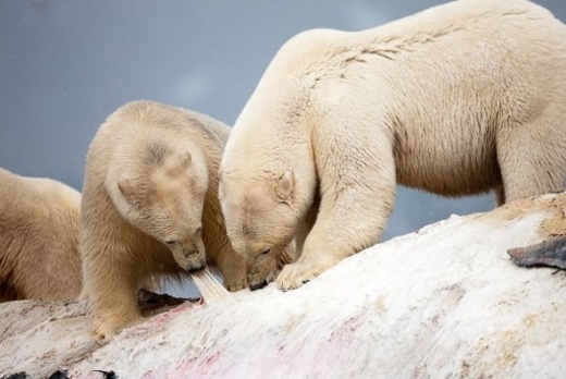 北極熊享用長鬚鯨屍體 拍攝於斯瓦爾巴特群島斯皮特薩伯根島的薩利哈瑪納港。 幾頭北極熊正在享用一頭長鬚鯨(學名Balaenoptera physalus)的屍體。