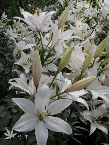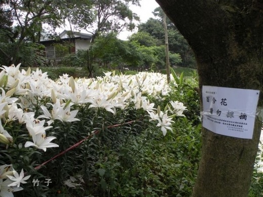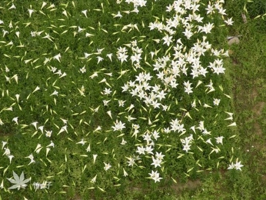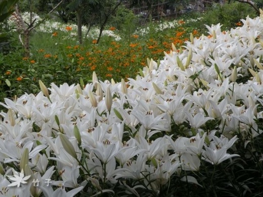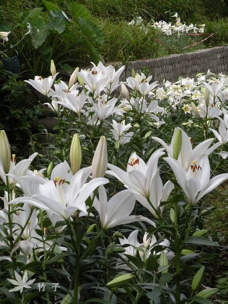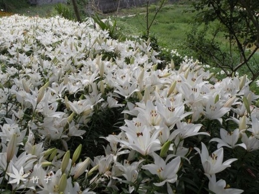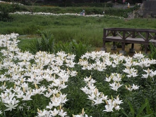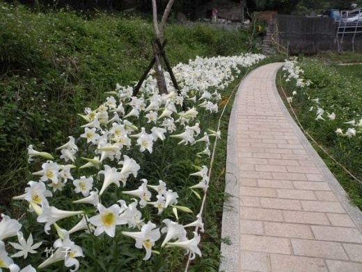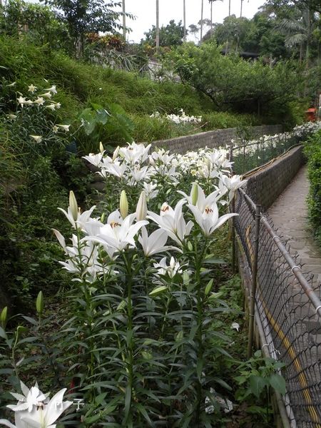 斜坡上 、木棧道旁,種滿了雪白的百合花 , 會不會種得太過於密集了?