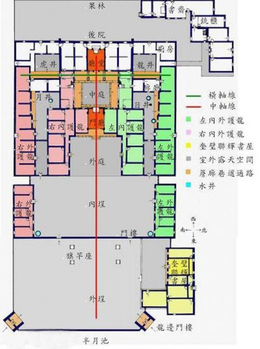 古宅前有一半月形水池,即所謂的「風水池」、「案前池」,水池和主建築之間被兩道院牆劃分為外埕與內埕兩部份,象徵舉人的四個旗杆台便四平八穩地落外埕,左側有「奎璧連輝」書房,從大埕到正廳之間,又有一道牆隔出內埕。