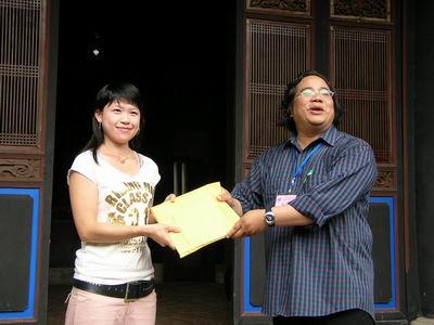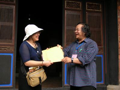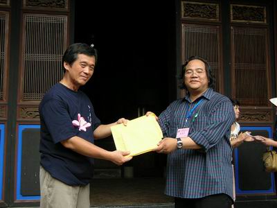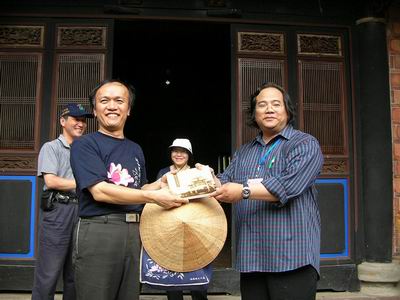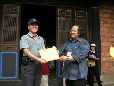 感謝桃園縣文化局解說志工 --- 踏查風城班長蔡清宗(右)送張德南老師編輯的書