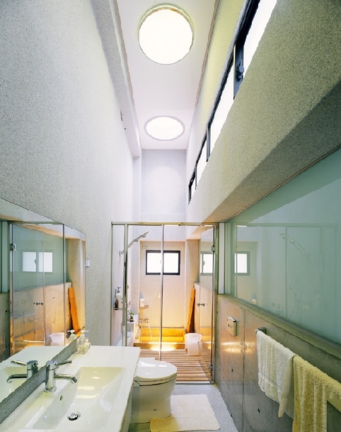 主臥室的浴室也是主臥室的一絕,由於配合下層的更衣室空間,浴室的室內淨寬度只剩下 一米 而已,為避免產生侷促之感,浴室的高度特別挑高拉到 4.8 米,也讓整個浴室感覺開闊起來。最特別的是,配合知名燈光設計師姚仁恭所設計的圓形頂燈,毛森江加上一個圓形同樣大小的開口,在開口部的下方則是採降板設計,可供淋浴的檜木浴缸,等於就在月光下淋浴泡澡一樣浪漫,由於浴缸內有洩水的處理,即使大雨淋進來也沒關係。