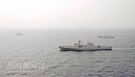中共海軍第六批護航編隊由南海艦隊“昆侖山”號船塢登陸艦、“蘭州”號導彈驅逐艦、兩型塢載艇和正在亞丁灣執行護航任務的“微山湖”號綜合補給艦組成☆