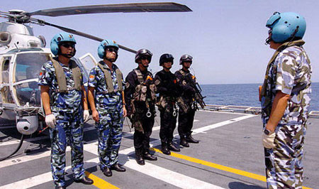 正在亞丁灣海域執行護航任務的中國海軍護航編隊,動用直升機將特戰隊員運送到“康盛口”號商船執行隨船護衛任務☆
