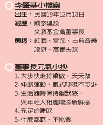 國泰建設文教基金會前董事長李肇基,80歲精神奕奕,若把他的年齡少說個20歲,沒有人會懷疑,連健檢報告都證實,他的「骨齡」才30多歲,不到實質歲數的一半,醫師還加註「骨質 年齡與年輕人相同」。