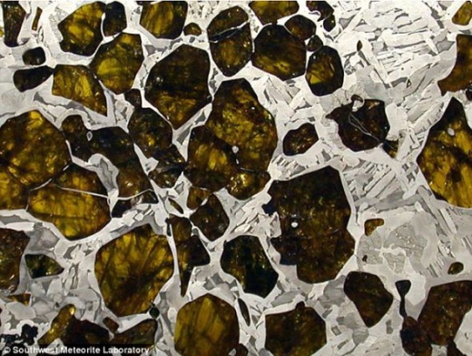 阜康隕石的特寫照片。這種隕石由金黃色的橄榄石和似銀一般閃亮的鎳-鐵構成,彷佛一件采用鑲嵌工藝的藝術品