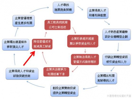 整個社會欣賞技術價值的老闆太少,為了提高營業利潤和向投資人交代,壓低員工薪資是最快的cost down方法,於是乎公司的優秀員工逐漸出走、劣幣換良幣,淘汰到最後成剩下只想依附在大公司裡領薪水的普通職員與走不開的員工,員工不想努力求突破,產品無法吸引國內外買家與消費者與購買,企業利潤逐漸下滑,企業和職場的循環進入了內層紅色的循環趨勢,整個社會變得無成長動力,投資者不再冒險,反而進入基本民生產業套利,如房地產炒作,炒房、炒地皮是短期內獲利的最快方式,走不開的人才不再想創新與創業,反而將聰明才智投入炒房炒地皮中,進一步使得房租和廠房租金直接或間接墊高商品的生產成本,商品價格無法在銷售市場具備競爭力,營運不佳,最終導致低薪惡性競爭市場。