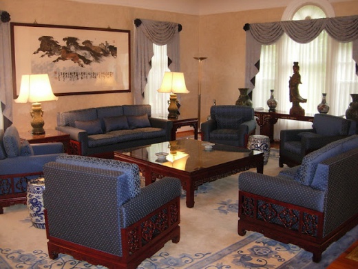 非常典雅的小藍廳。家具多為紫檀木所製,沙發、座墊、地毯、窗簾等均有精緻的花紋,牆上的畫作都出自名家