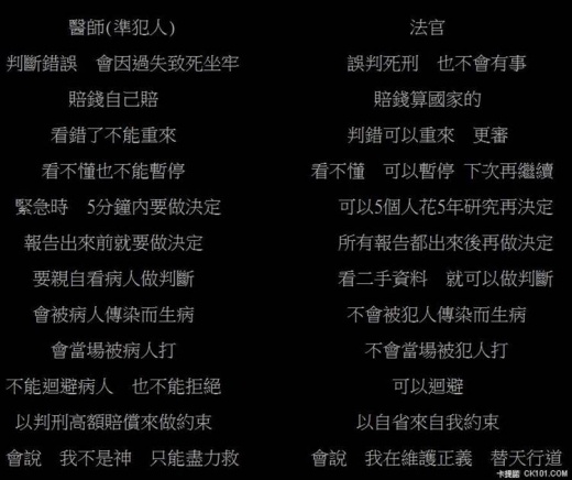 一位鄉民自製《醫師與法官比較表》,小弟看後會心一笑,列的相當中肯。