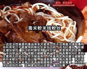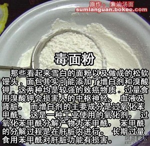 - 全國全部麵粉都添加漂白劑,大部份麵粉中漂白劑過氧化苯甲□超量,長期食用後身體會出現疲勞、頭昏、失眠、多夢、神經衰弱等不適感