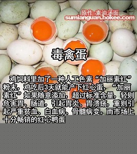 - 用加麗素紅餵養的雞所產的紅心雞蛋,引起嚴重貧血、白血病、骨髓病變等;