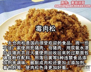 - 太倉肉鬆的原料使用了死豬肉、母豬肉、並且大量使用豆粉,用雙氧水漂白母豬肉呸病死豬被製成肉鬆還要加上添加劑、著色劑等,使肉鬆色澤更加好看