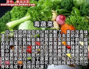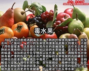 - 殘留農藥超標的蔬菜水果(百菌清、倍硫磷、苯丁錫、草甘膦、除蟲尿、代森錳鋅、滴滴涕、敵百蟲、毒死蜱、對硫磷、多菌靈、二秦磷、氟氰戊菊酯、甲拌磷、甲□威、甲霜靈、抗蚜威、克菌丹、樂果、氟氯氫菊酯、氯菊酯、氰戊菊酯、炔鹹亍8縵酮、三唑錫、殺螟硫磷等);巨毒高殘留農藥的張北"無公害"蔬菜;