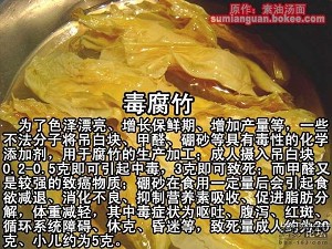 - 用掉白塊、鹼性嫩黃口、工業明膠等化學致癌物質加工製作出的腐竹;