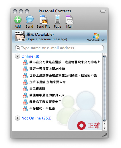 而這個好玩的即時通訊軟體還有顯示目前狀態的功能,我建議只要在上班時間永遠顯示為〝忙碌〞,不知為什麼,大家都會相信這是真的。更棒的是,msn還提供了自己命名的功能,你可以藉由文字來表達你目前心中的感想,這些文字一定要像雜誌廣告上的主標題一樣寫得撲朔迷離且釣人胃口,讓所有看到你上線的人百思不得其解進而心中充滿了猜測。若是他們忍不住的問你,這時你就可以照著你高興肆意虎爛一番。例如以前我寫過一個命名:我的肝如同煙火般燦爛,結果有不少人因為這個命名來問候我,若是這些人屬於上級長官或公司同事,我一律回答:唉∼說來話長啦,你不會想要知道的,嗚∼我先忙啦,掰 就這樣,很多人當時以為我忙翻了,但事實上我的標題是在寫我每天沈溺的魔獸世界。所以這個命名功能實在要好好利用,用得巧妙,保證你可以在公司中為自己塑造出一個認真打拼的好形象!